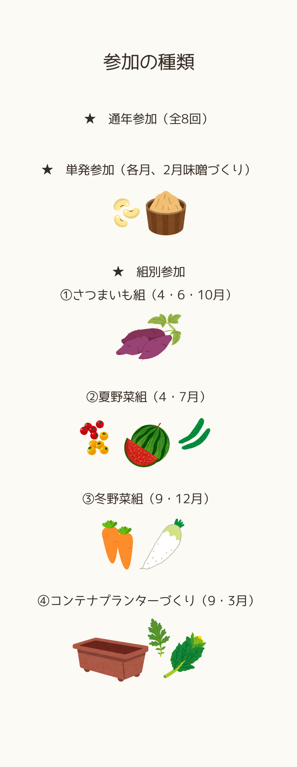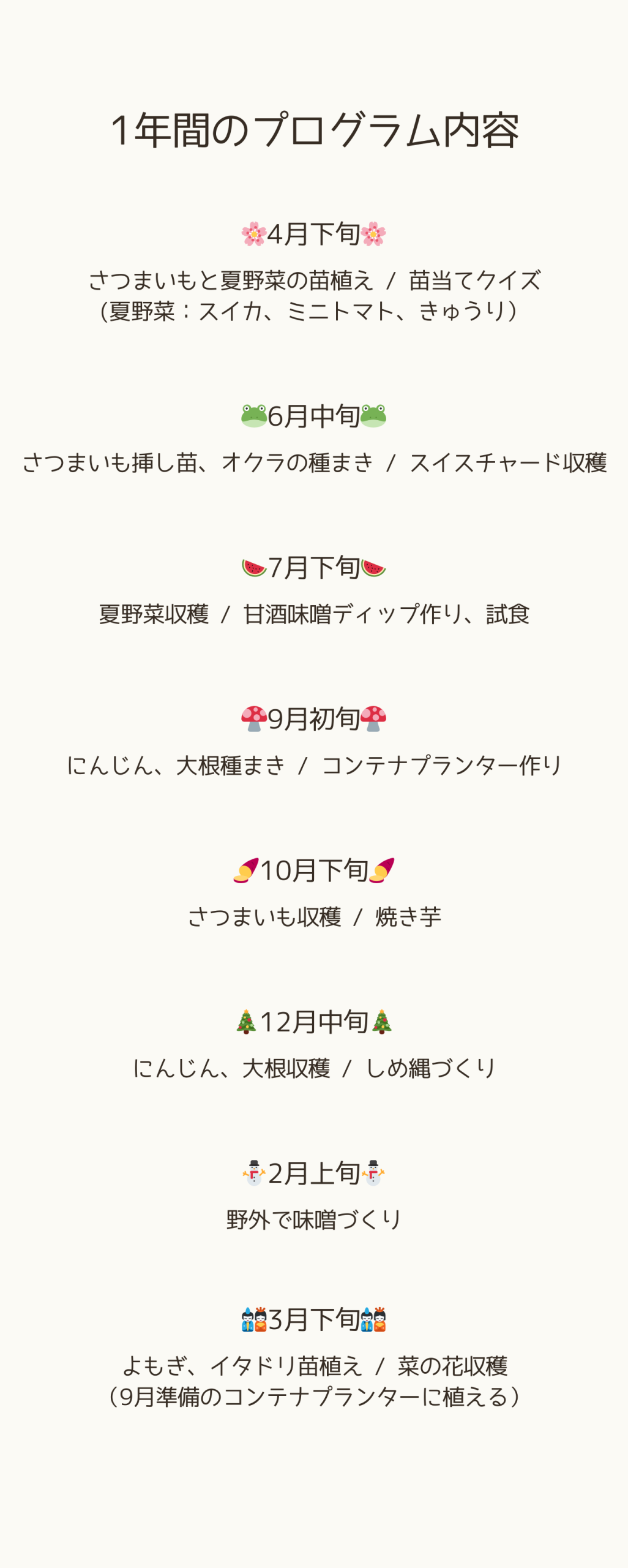 親子畑サークル「親子でほっこり畑のじかん」 イベント案内 X Facebook0 はてブ0 LINE コピー 2026.03.25 画像1: 画像2: ■イベント詳細: 親子対象の菌ちゃん畑での半日体験WSです! 詳細はお申込みページをご覧ください^^ ■郵便番号: 6691211 ■イベント開催地: 兵庫県 ■開催地住所: 兵庫県宝塚市大原野下ヶ峰宝塚市道2963号線沿い ■申し込み方法: 申し込みフォーム有 ■申込先: https://dn8eb.hp.peraichi.com ■連絡先: 菌ちゃんウネ作り屋さん・アドバイザー/管理栄養士 野村知里 Instagram : @chii_sanom