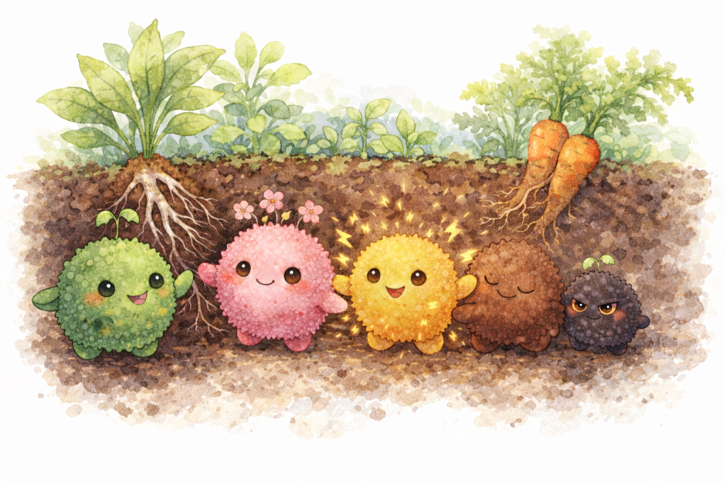 その元気な野菜が育つには実は色々な微生物(菌)が大きく関係しているんだ。